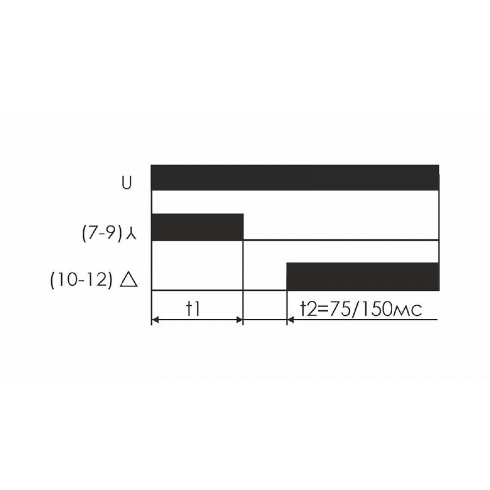 Реле времени имеет 2 релейных выхода. Каждый управляет отдельным контактором. В момент пуска его первый выход включает контактор S? (замыкаются контакты 7-9) и обмотки электродвигателя подключаются по схеме «ЗВЕЗДА», что снижает пусковой ток в несколько раз. По окончании времени выхода двигателя на рабочий режим (время t1) наступает пауза (t2), когда оба контактора выключены, затем включается контактор S? (замыкаются контакты 10-12), включающий обмотки по схеме «ТРЕУГОЛЬНИК».