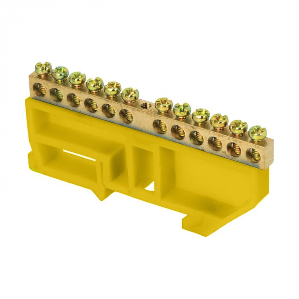 Шина нулевая N 6х9 12 отвер. латунь желт. изолятор на DIN-рейку sn0-63-12-dz-r, Блок клеммный и нулевая шина