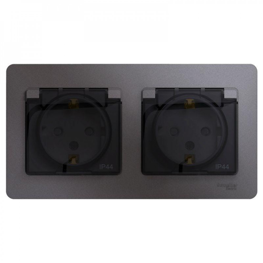 Розетка 2-м СП 2мод. Glossa 16А IP44 с заземл. защ. шторки в сборе графит SE GSL001347, Розетка скрытого монтажа