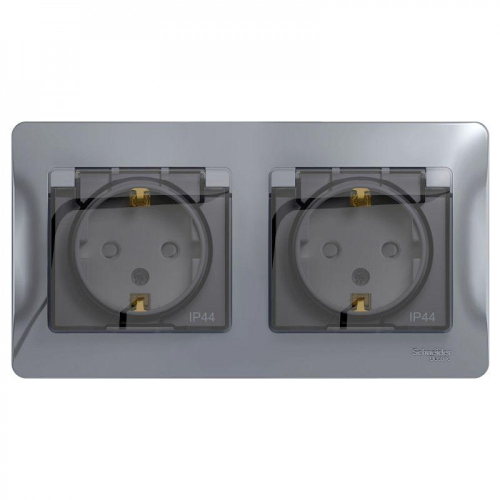 Розетка 2-м СП 2мод. Glossa 16А IP44 с заземл. защ. шторки в сборе алюм. SE GSL000347, Розетка скрытого монтажа