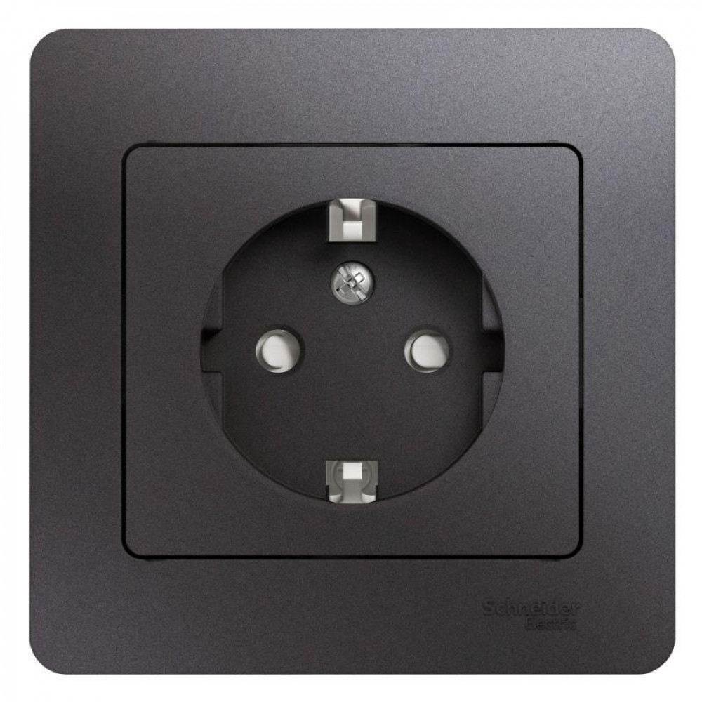 Розетка Glossa (в сборе, цвет графит) одинарная с заземлением и без шторок подходит для сетей 250 В, на ток 16 А.