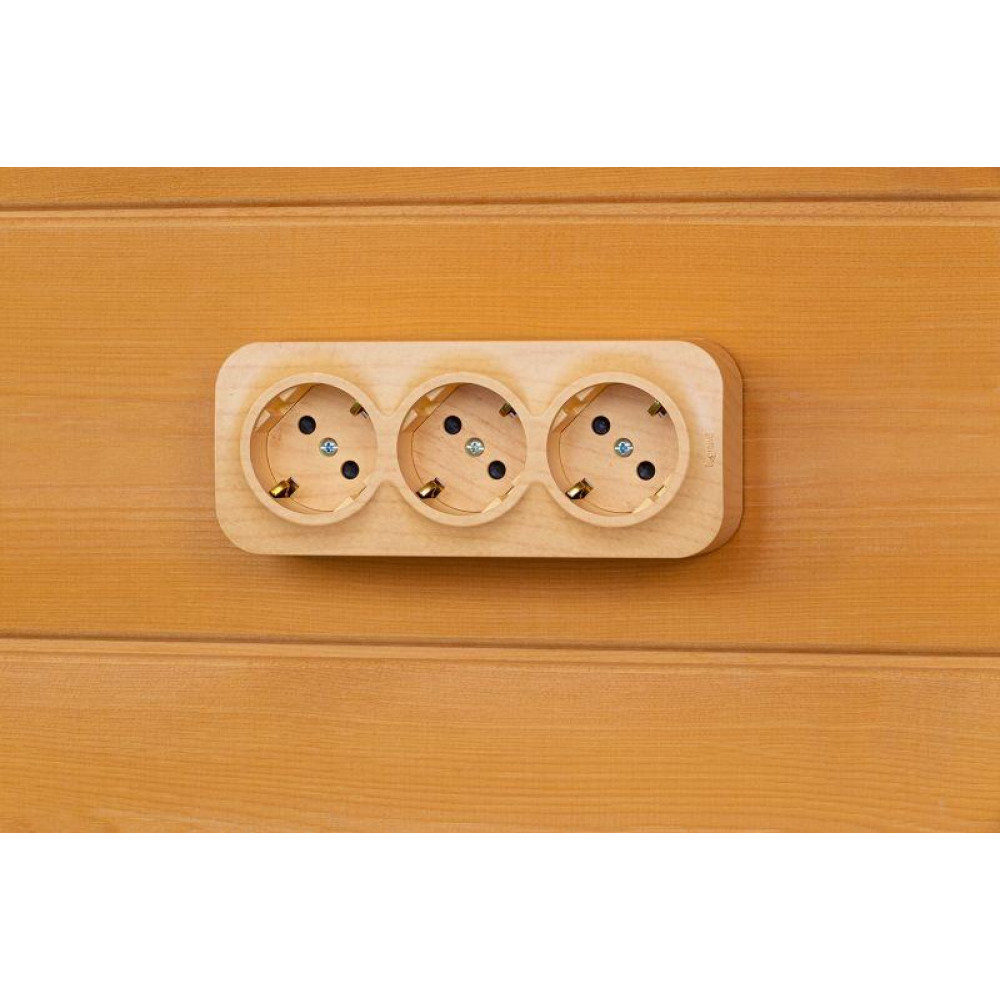 Тройная розетка с заземлением, со шторками Legrand Quteo, цвет дерево, для открытого монтажа. Максимальный ток 16 А, максимальная мощность 3680 Вт. Применяется в зданиях, оборудованных для повышения безопасности проводкой с заземлением (с защитным проводником). Рекомендуются к применению в помещениях в которых могут быть дети. Шторки осуществляют защитную функцию путём ограничения доступа к токоведущим контактам. Доступ открывается только при подключении вилки.