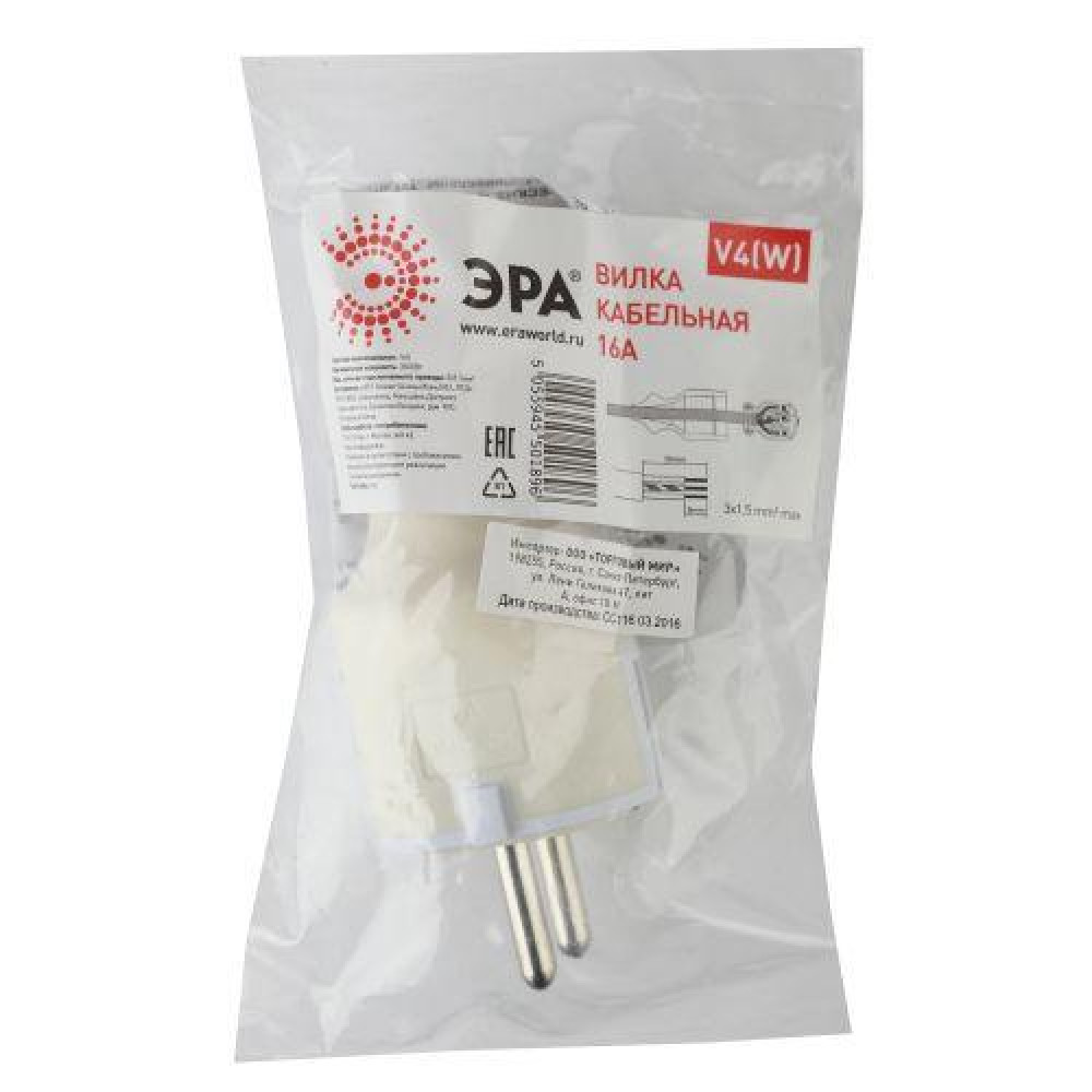 Описание Вилка V4(W) 16А с заземл. прямой ввод (10/200/6000) бел. ЭРА Б0019188
