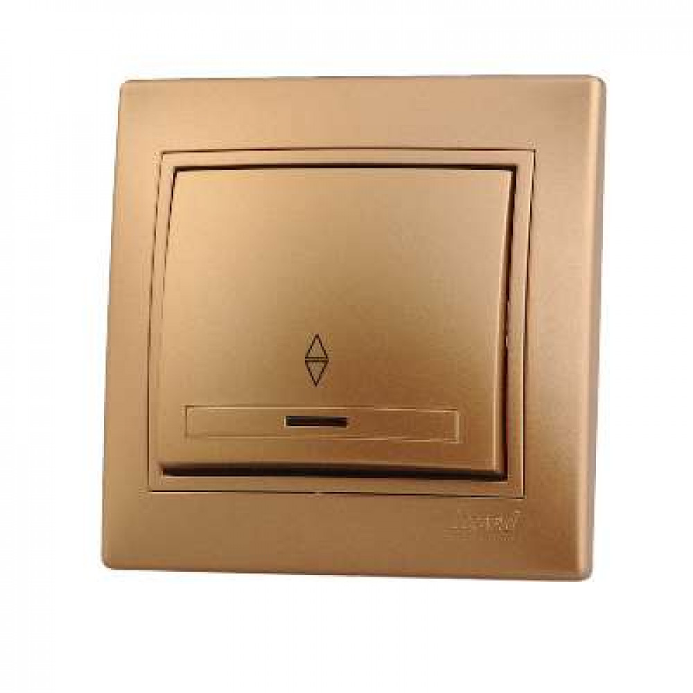 Переключатель проходной 1-кл. СП Mira 10А IP20 с подсветкой со вставкой зол. метал. 701-1313-114, Выключатель и переключатель скрытого монтажа