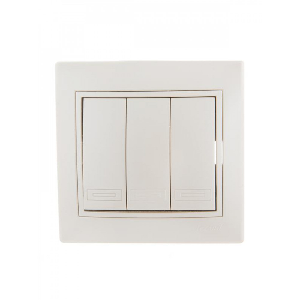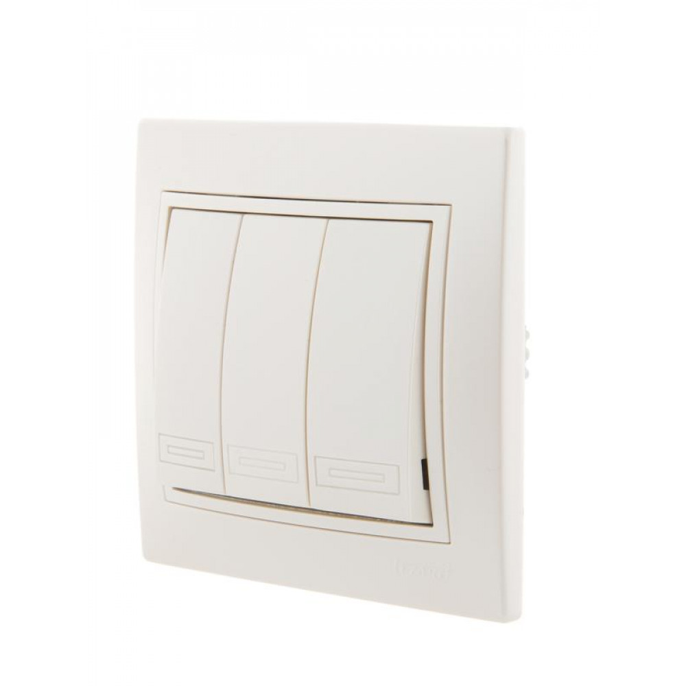 Выключатель 3-клавишный это двухпозиционный коммутационный аппарат с замыкающими (нормально-разомкнутыми) контактами, предназначенный для работы в сетях с напряжением до 1000 вольт, не предназначенный для отключения токов короткого замыкания, без специальных устройств дугогашения, местного управления, с ручным приводом.