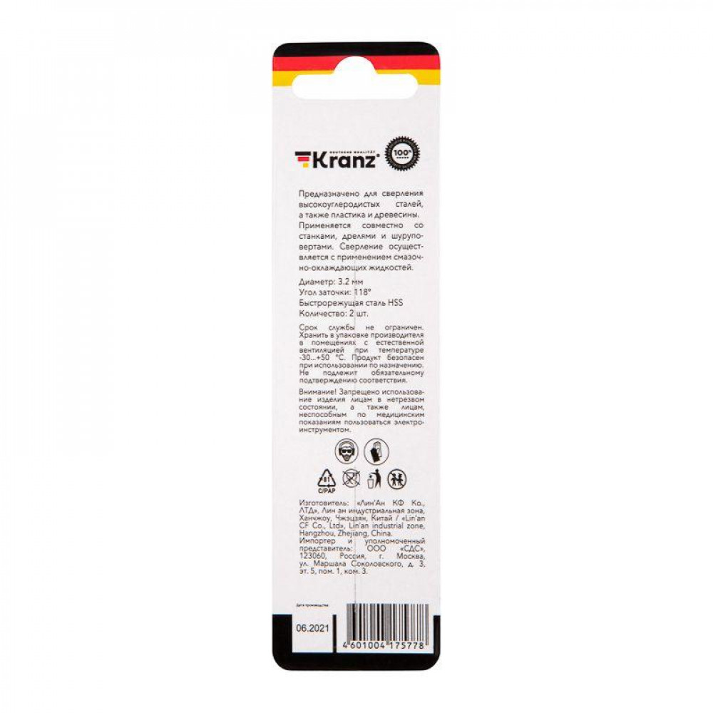 Сверло по металлу 3.2мм HSS DIN 338 (уп.2шт) KR-91-0557, Сверло, метчик, плашка