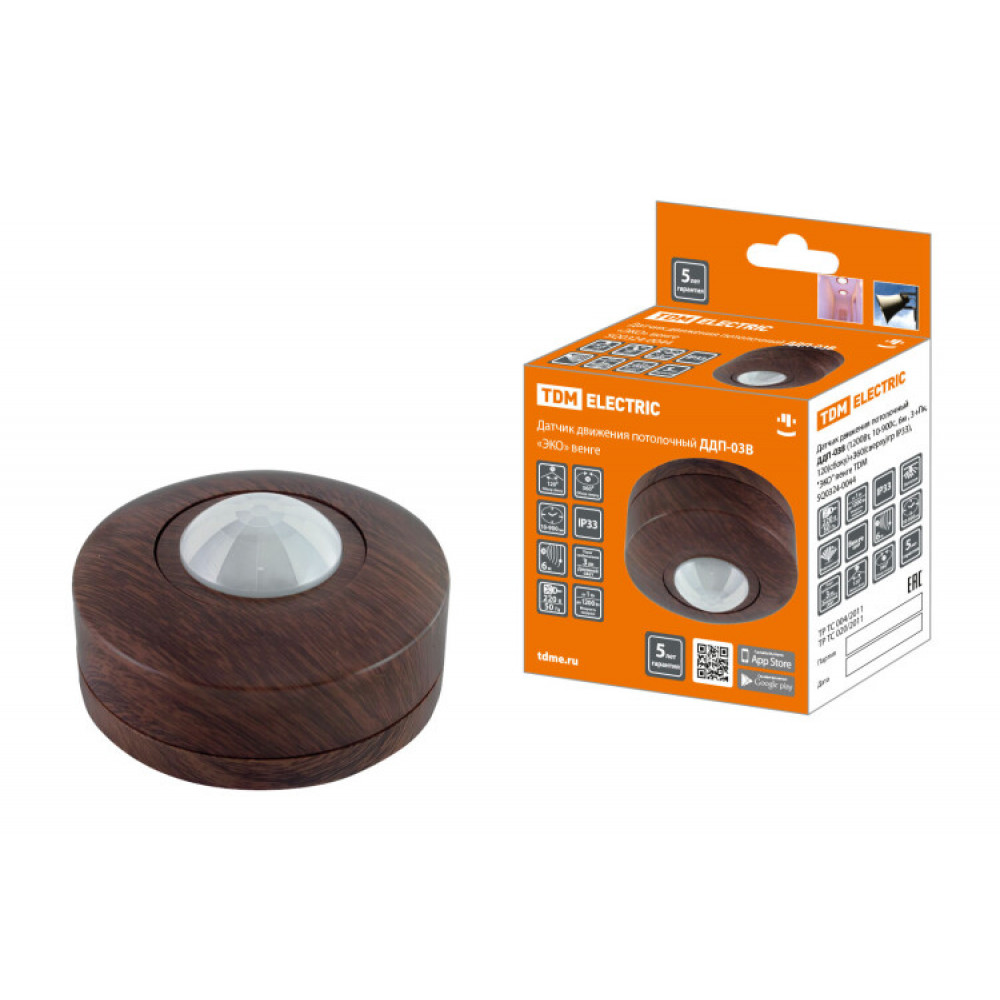 Описание Датчик движения потол. ДДП-03В (1200Вт, 10-900с, 6м , 3+Лк, 120(сб)+360(св)гр IP33), "ЭКО" венге SQ0324-0044