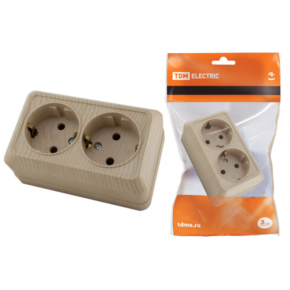 Описание Розетка двойная 2П+З открытой установки IP20 16А, сосна "Ладога" SQ1801-0052