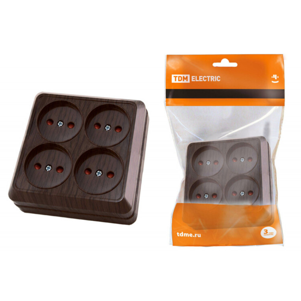 Розетка четырехместная 2П открытой установки IP20 10A с защитными шторками бук "Ладога" SQ1801-0321, Розетка открытого монтажа
