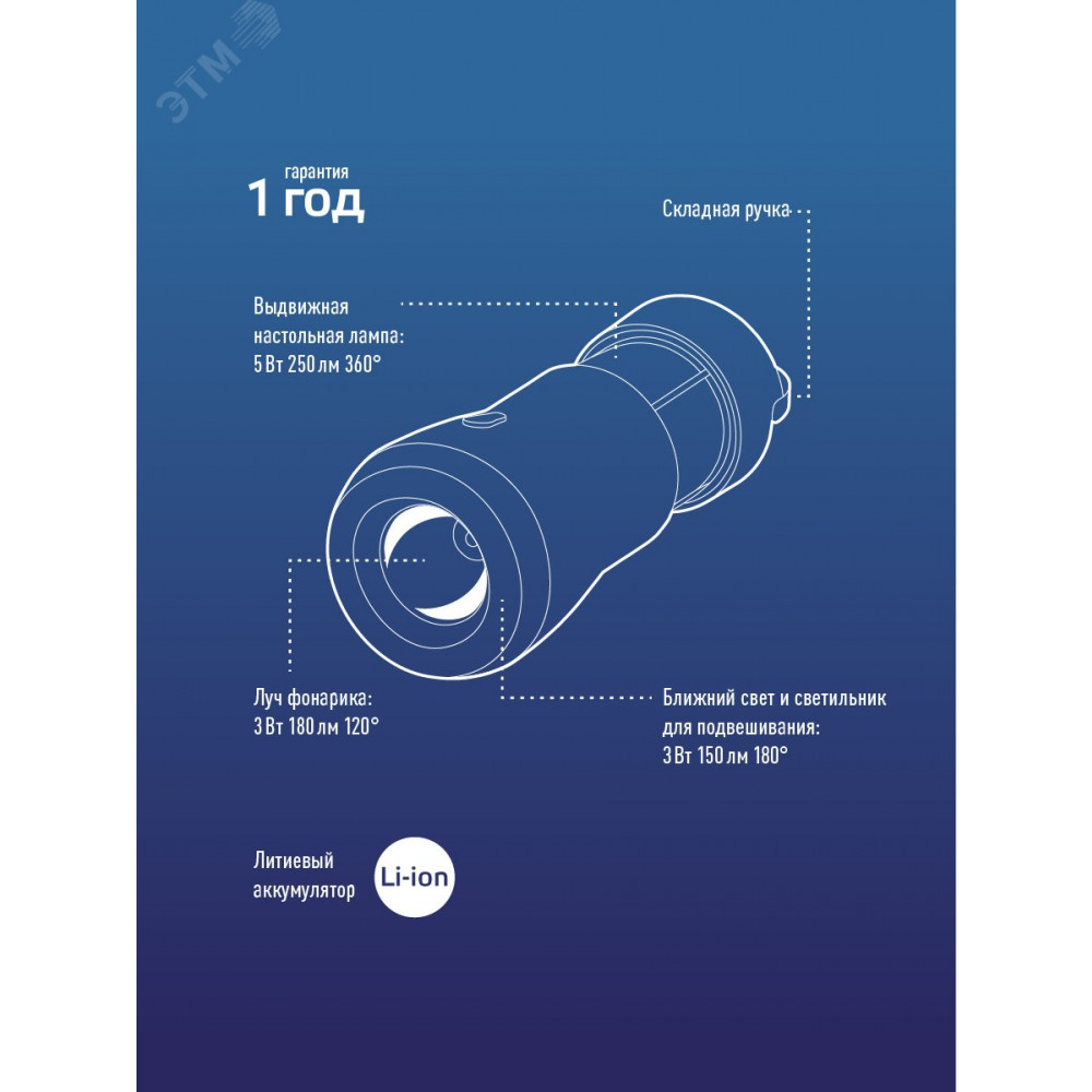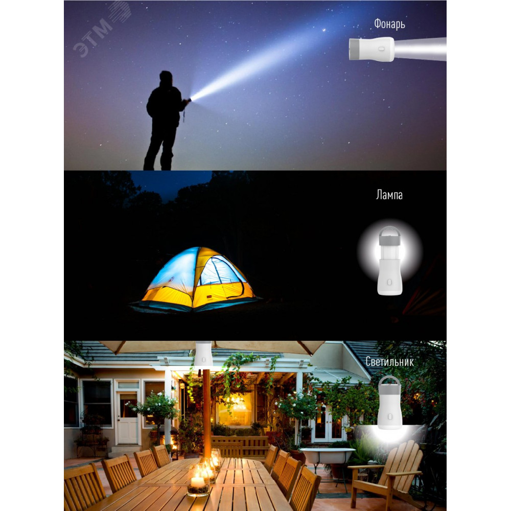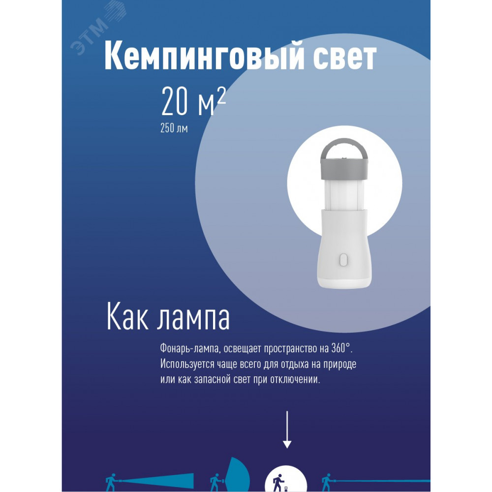 Компактный фонарь-лампа 3-в-1 со встроенным светильником на 180 и 360 градусов. Лампа складная - секция с лампой-светильником выдвигается из корпуса. Матовый рассеиватель дает мягкий, рассеянный свет, приятный для глаз. Совмещает луч фонаря (светит как фара автомобиля, направленный свет с ярким пятном засветки в центре) и свет кемпинговой лампы (освещает пространство вокруг себя) и широкий свет. Длина луча - 60 м, время беспрерывной работы - до 4 ч. Площадь освещения светильника в одну сторону - 15 кв. м, в обе стороны - 20 кв. м, время беспрерывной работы - до 3 ч. Современный литиевый аккумулятор 3,7В 1200 мАч, подзарядка от USB. Упакован в коробку с подробной информацией о модели и схемой фонаря.