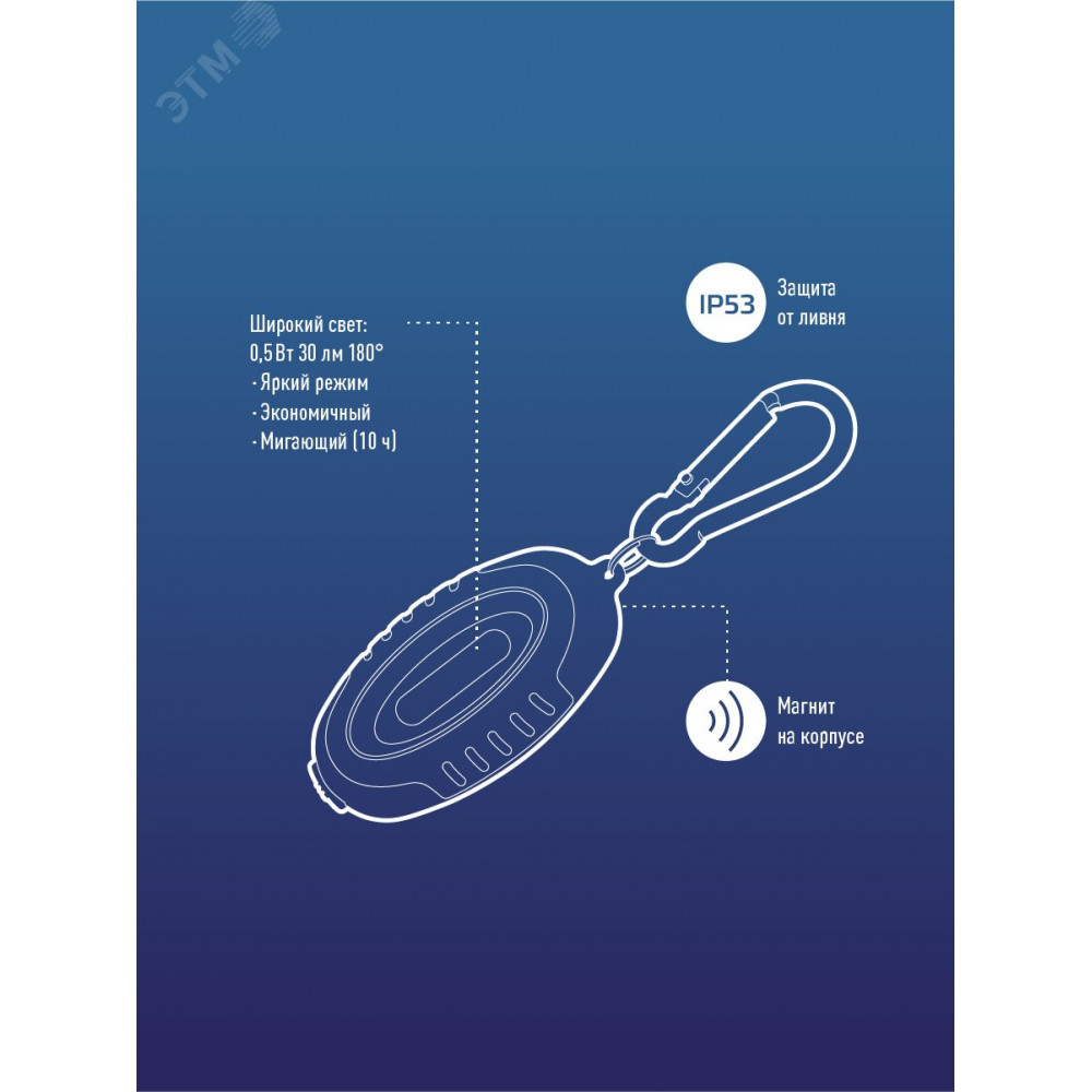 Фонарь-брелок востребованной конструкции с прорезиненным корпусом КОСМОС (KOC201B). На корпусе магнит – можно повесить на металлическую поверхность. Литиевые батарейки уже внутри. Светит широким светом (освещает широкое пространство с одной стороны). Три режима работы – яркий, средний и мигающий. Источник света - 0,5 Вт COB LED. Источник питания - батарейки 2xCR2032 (входят в комплект). Количество режимов - 3 (яркий-экономичный-мигающий). Световой поток - 30 лм. Дистанция освещения - 4 м2. Корпус - ABS-пластик c каучуковым напылением, IP53. Компактный карманный размер - 7x3.4x2 см. Магнит на корпусе. Карабин.