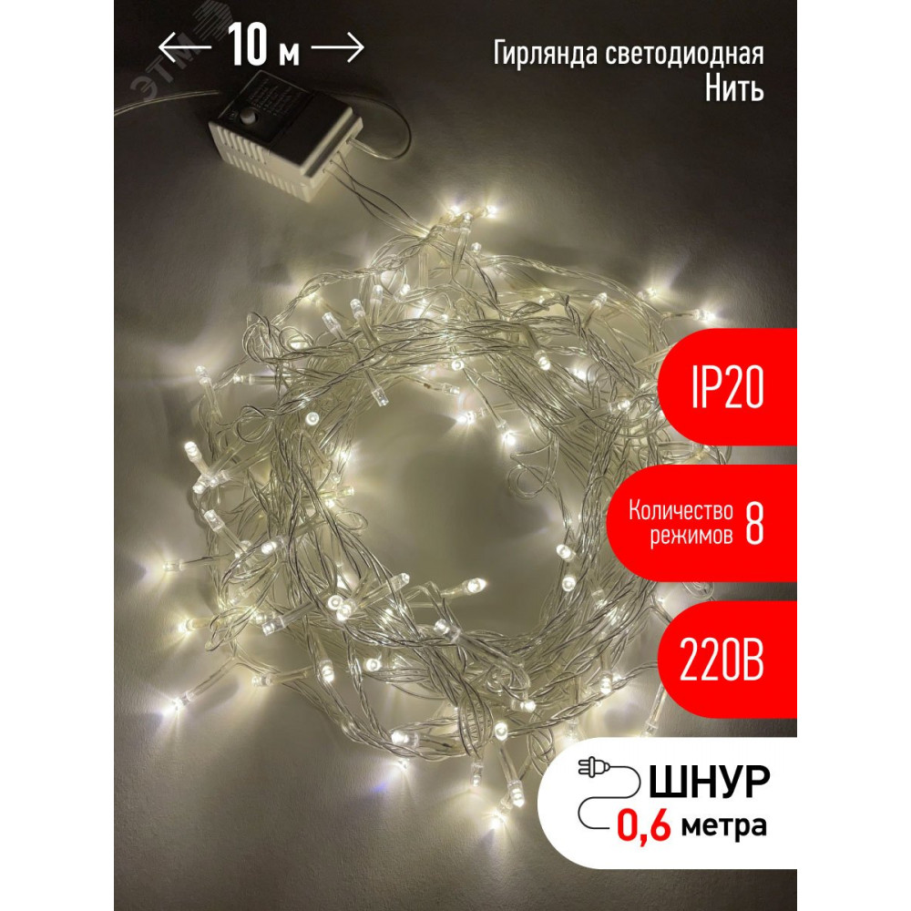 Доставка ENIN-10B Гирлянда LED Нить 10 м теплый свет 8 режимов, 220V, IP20 (60/720) Б0041894