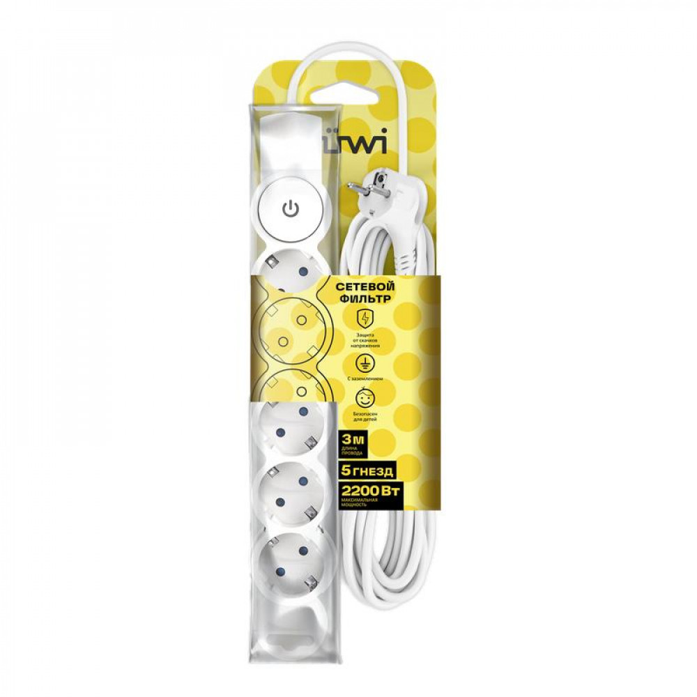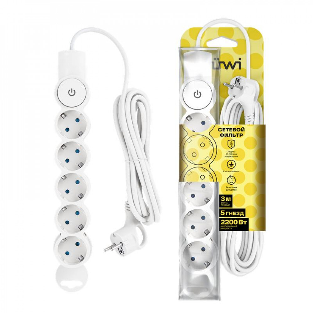 Фильтр сетевой 5х3м с/з со шторками с выкл. 2200Вт 10А бел. 32576 5, Удлинитель, сетевой фильтр