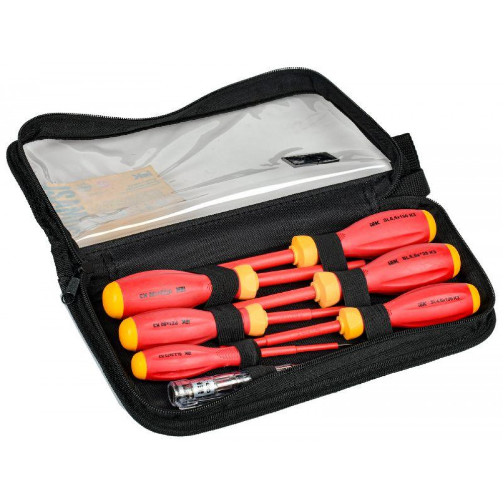 Набор диэлектрических отверток серии К3 рассчитан на использование под напряжением до 1000В. Набор включает в себя: крестообразные отвертки PZ1x80, PZ2х100; шлицевые - SL2,5х75, SL4,0х100, SL5,5х125, SL6,5х150 и отвертку-пробник ОП-1.