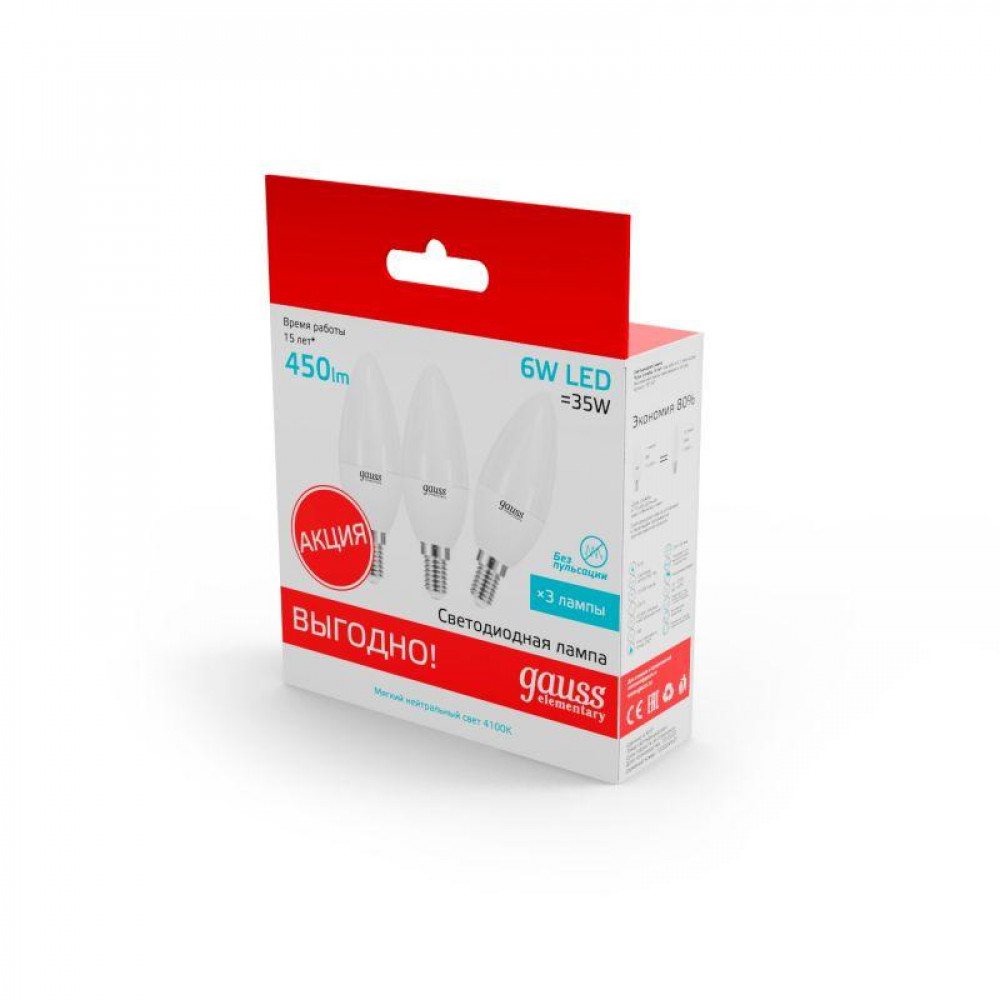 Описание Лампа светодиодная Elementary 6Вт свеча 4100К нейтр. бел. E14 450лм (уп.3шт) 33126T