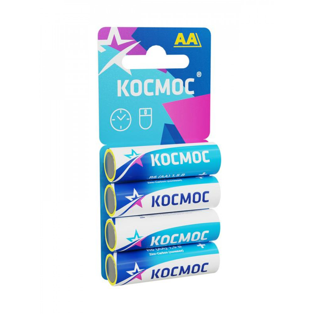 Солевые (цинк-углеродные) батарейки Космос – в упаковке 4 шт. Типоразмер батареек АА также называют «пальчиковые» (на приборах-потребителях может обозначаться как LR6, R6, UM3). Защищены от протечек по технологии Super Heavy Duty. Толстый корпус батарейки легирован против коррозии. Важно - солевые батарейки предназначены для маломощных устройств, например пульт или часы - для игрушек и более мощных устройств лучше выбрать щелочные