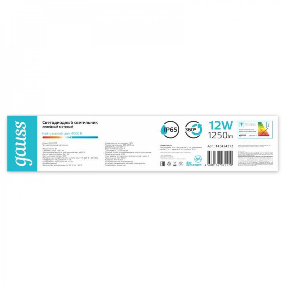 Описание Светильник светодиодный 590х29х29мм 12Вт 4000К 1250лм IP65 COMPACT линейный матов. 143424212