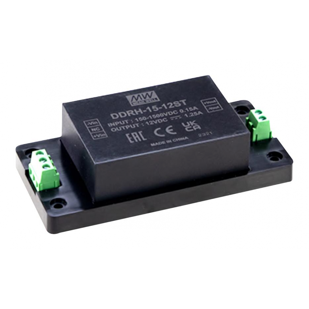 DDRH-15-12ST, DC-DC, 15Вт, вход 150…1500 В DC, выход 12В/1.25А, КПД=79%, изоляция 4000В DC, максимальная емкостная нагрузка 1250мкФ, 122.3х57.3х32мм, -40...+85°С, на шасси
