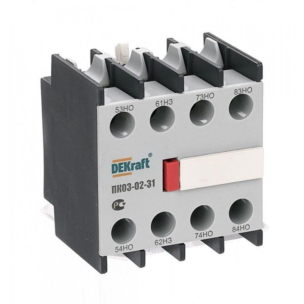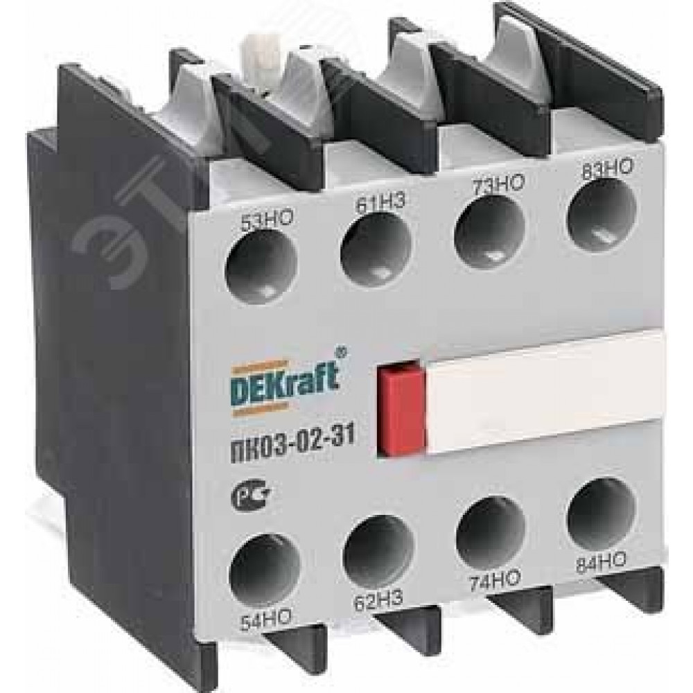 Приставка контактная серии ПК-03-02 для контакторов КМ-103 DEKraft; кол-во контактов - 3НО+1НЗ; ном.ток – 10 А; ном.напряжение – до 690 В; установка – с лицевой стороны; степень защиты – IP20. Приставки контактные предназначены для увеличения количества вспомогательных контактов контактора. Контактные приставки механически соединяются с контакторами и фиксируются при помощи защелки. Приставка подходит для использования с контакторами других производителей.