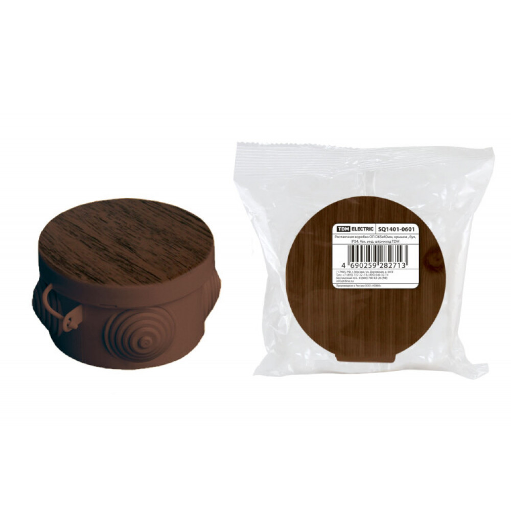 Описание Распаячная коробка ОП D65х40мм, крышка , "ЭКО" (венге), IP54, 4вх. инд. штрихкод SQ1401-0601