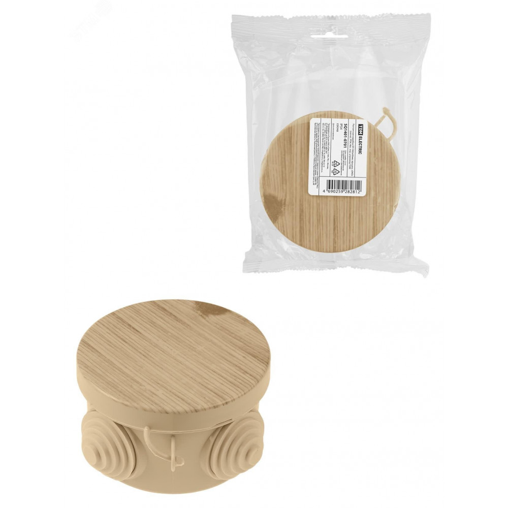 Описание Распаячная коробка ОП D65х40мм, крышка, "ЭКО" (сосна), IP54, 4вх. инд. штрихкод SQ1401-0701