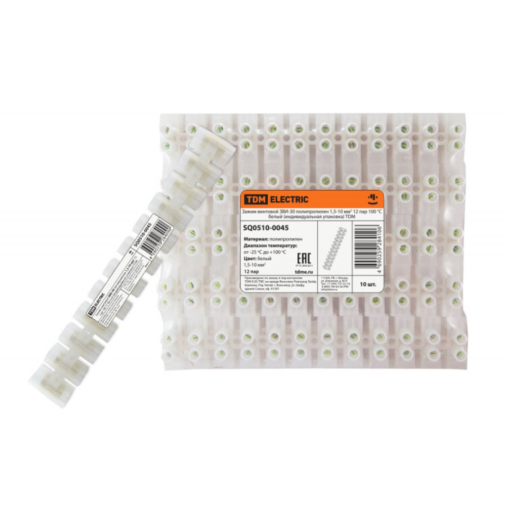 Зажим винтовой ЗВИ-30 полипропилен 1,5-10мм2 12пар 100°С белый (индивидуальная упаковка) SQ0510-0045, Блок клеммный и нулевая шина