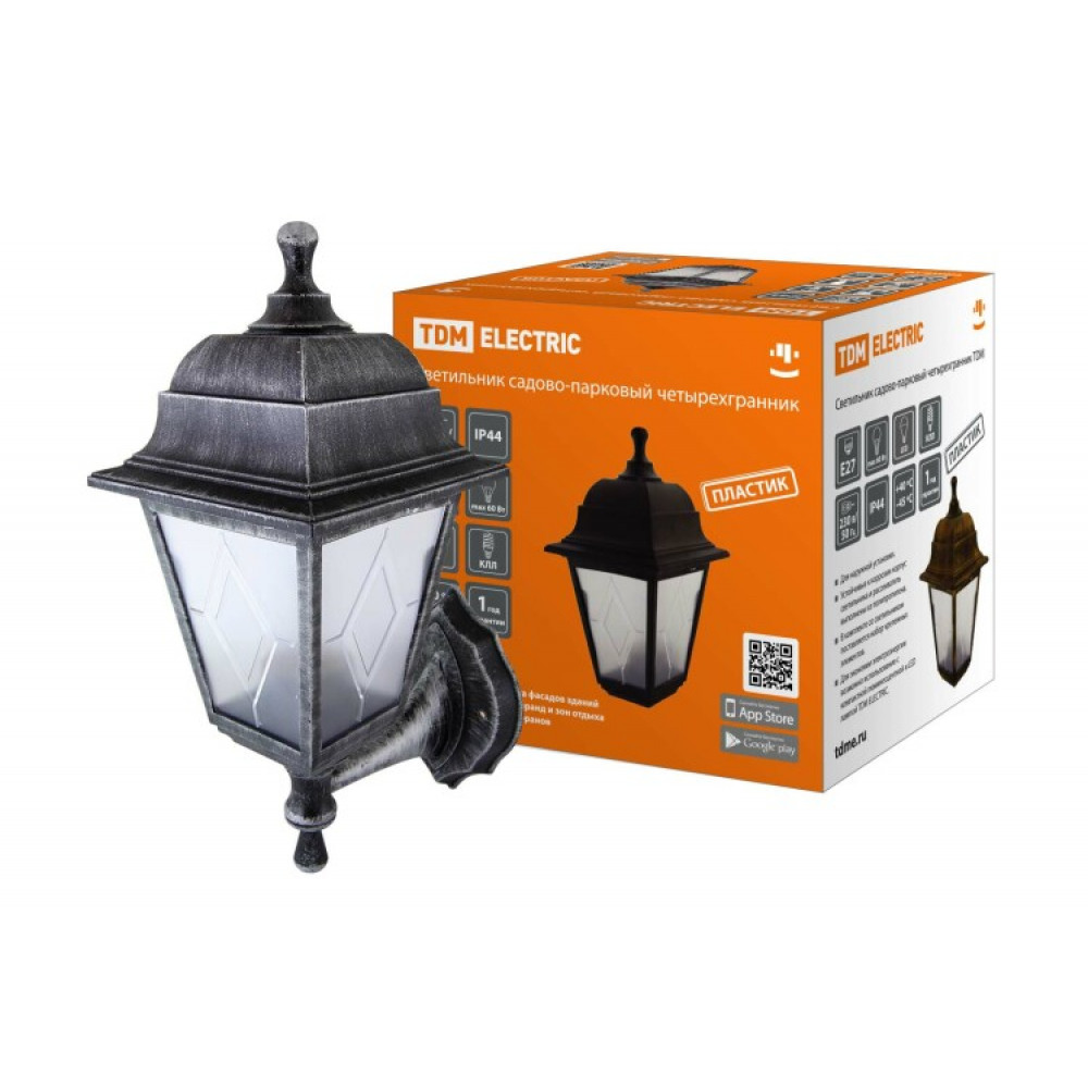 Описание Светильник садово-парковый НБУ 04-60-001 четырехгр., настенный, пластик, расс.пластик, серебро SQ0330-0794