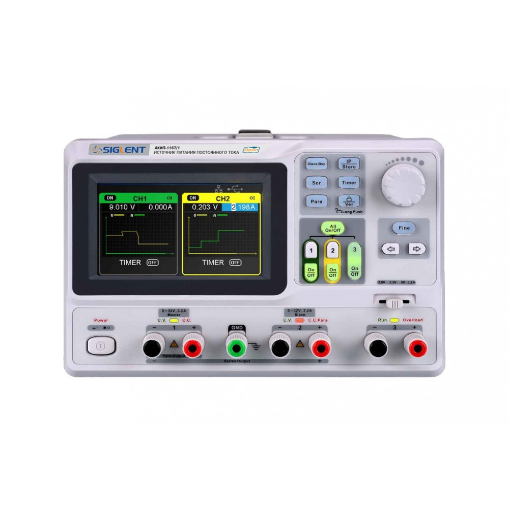 АКИП-1167/1, Источник питания постоянного тока 204.8Вт, 1 канал 0-32В/3.2А, 2 канал 0-32В/3.2А, 3 канал 2.5В/3.3В/5В/3.2А, дискретность 1мВ/ 1мА