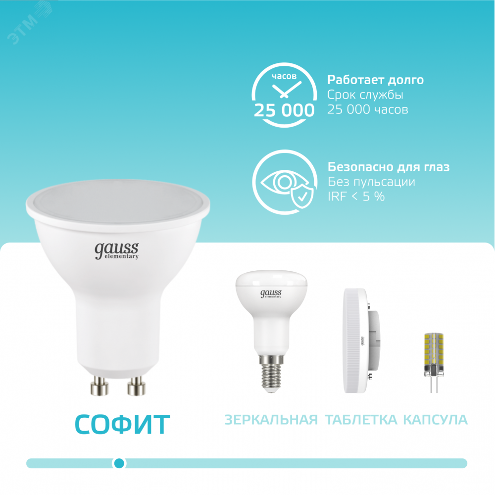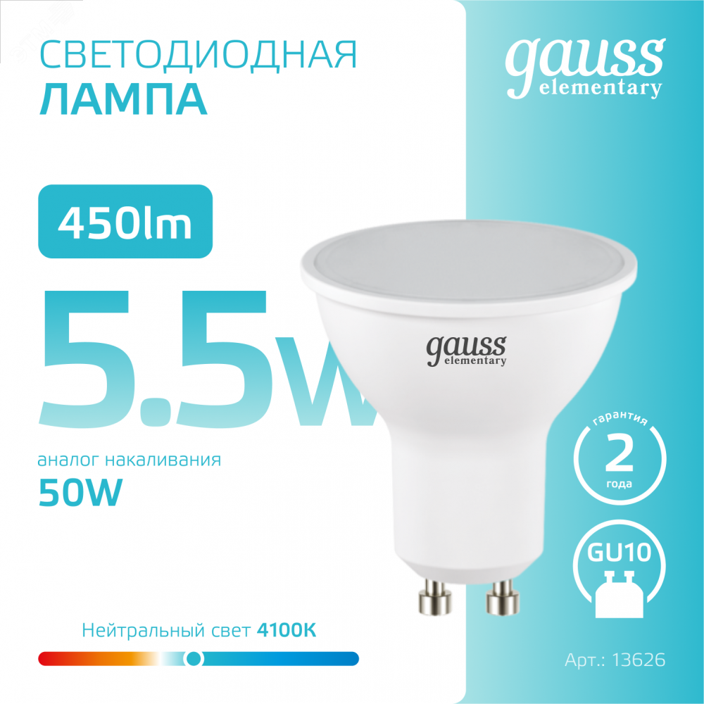 Лампа светодиодная Elementary 5.5Вт MR16 софит 4100К нейтр. бел. GU10 450лм 13626, Лампа светодиодная