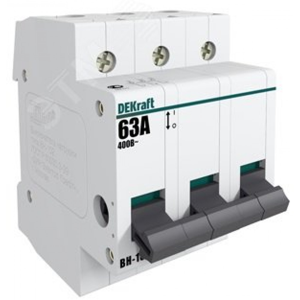 Выключатель-разъединитель серии ВН-102 DEKraft; 3P; номинальный ток 100 А; установка – на DIN-рейку; установочное положение - любое. Выключатели-разъединители применяются для ручного включения/отключения сетей напряжением до 400 В. Специальные мостиковые контакты обеспечивают надежный разрыв цепи; они полностью исключают возможность перекрытия дугой по изоляции. Усиленная рукоятка управления обеспечивает большое количество включений/отключений.