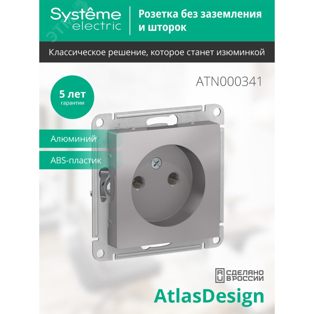 Механизм AtlasDesign (цвет алюминий) розетки одинарной без заземления и без шторок подходит для сетей 250 В, на ток 16 А.
