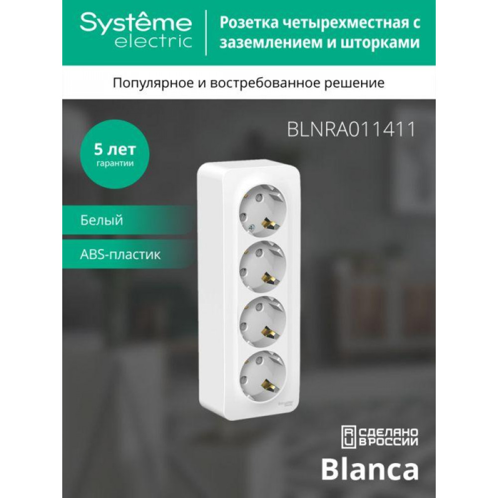 Описание Розетка 4-м ОП Blanca 16А IP20 250В с заземл. защ. шторки с изолир. пластиной бел. SE BLNRA011411