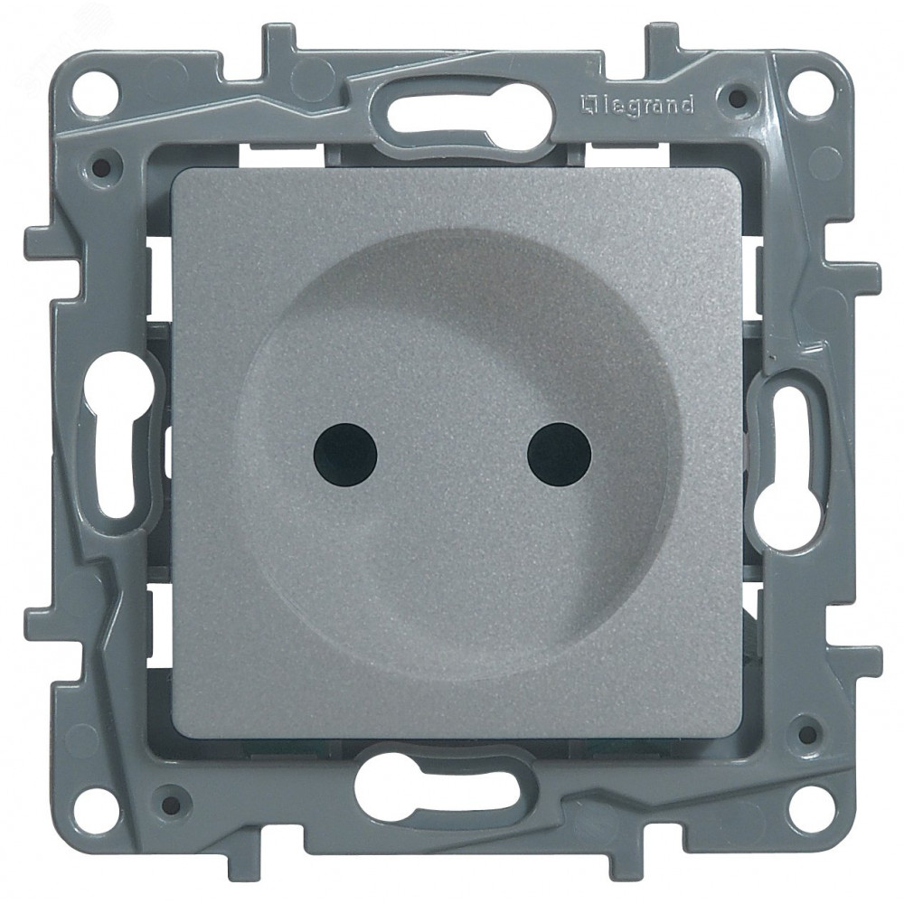 Розетка без заземления Legrand Etika для скрытого монтажа, цвет алюминий. Максимальный ток 16 А, максимальная мощность 3680 Вт. Применяется в зданиях с проводкой без заземления (без защитного проводника). Рекомендуются к применению в квартирах и помещениях с детьми. Шторки осуществляют защитную функцию путём ограничения доступа к токоведущим контактам. Доступ открывается только при подключении вилки.