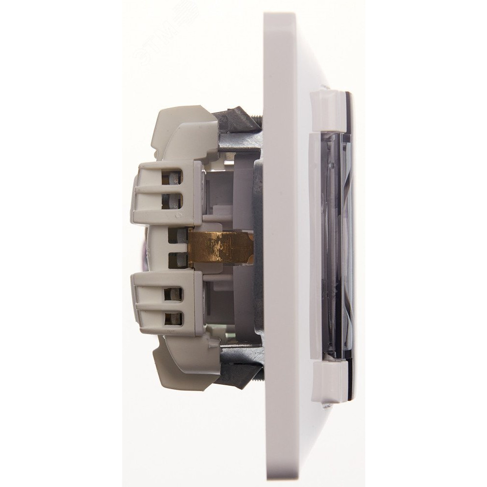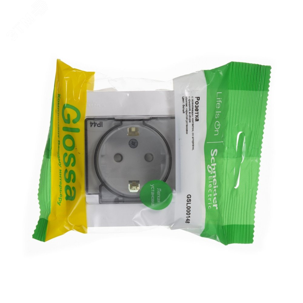 Розетка Glossa (в сборе, цвет белый) одинарная с заземлением, шторками и крышкой подходит для сетей 250 В, на ток 16 А.
