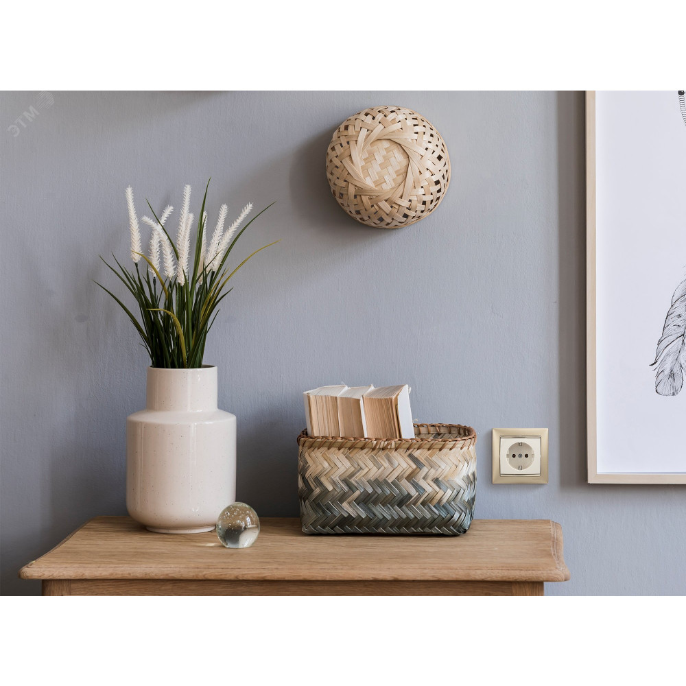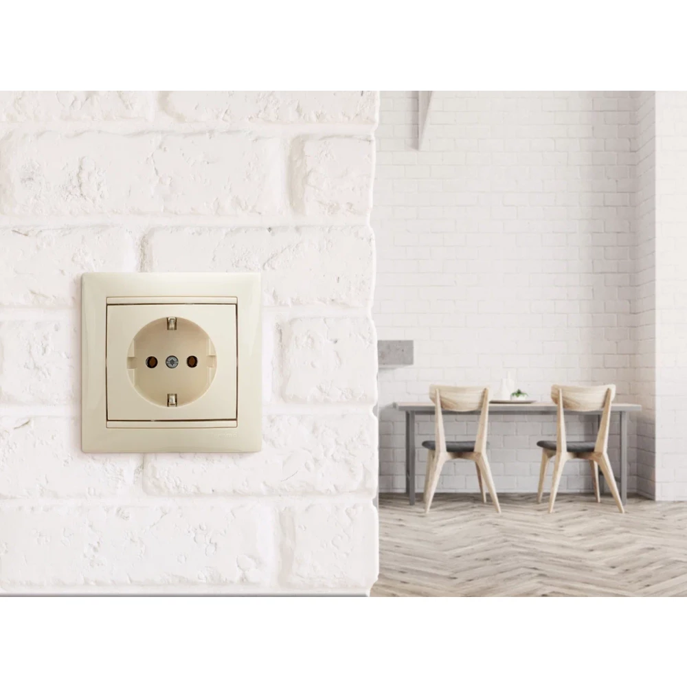 Представляет собой одноместный модуль розетки, со стороной 71 мм, с защитным контактом стандарта SCHUKO. Изготовлен из пластика, с необработанной поверхностью, цвета слоновой кости. Монтируется под штукатурку.