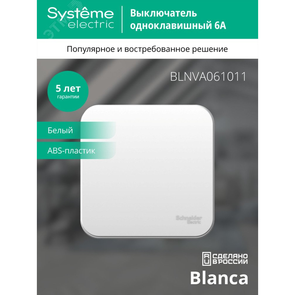 Выключатель 1-кл. ОП Blanca 6А IP20 (сх. 1) 250В с изолир. пластиной бел. SE BLNVA061011, Выключатель и переключатель скрытого монтажа