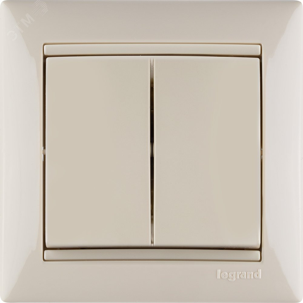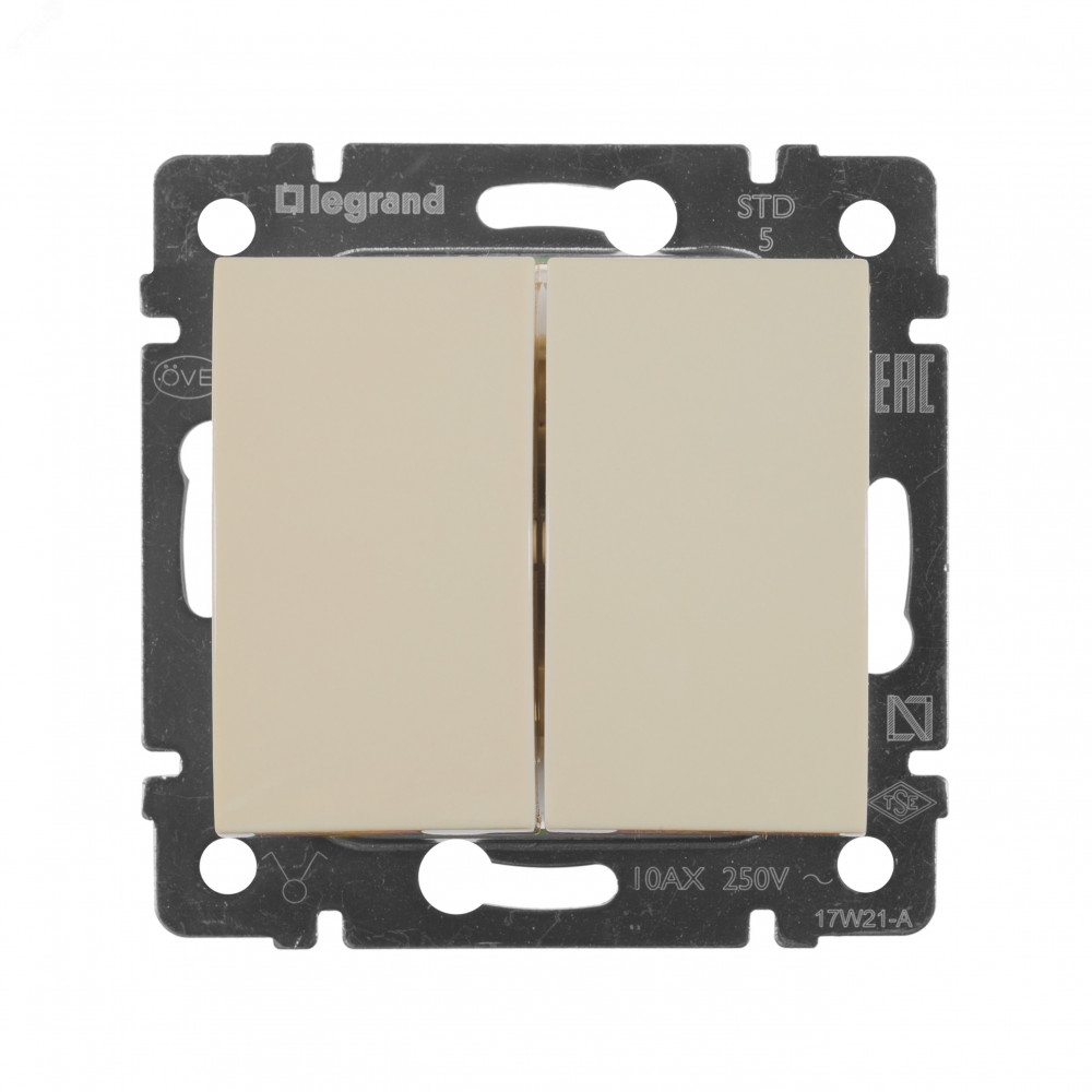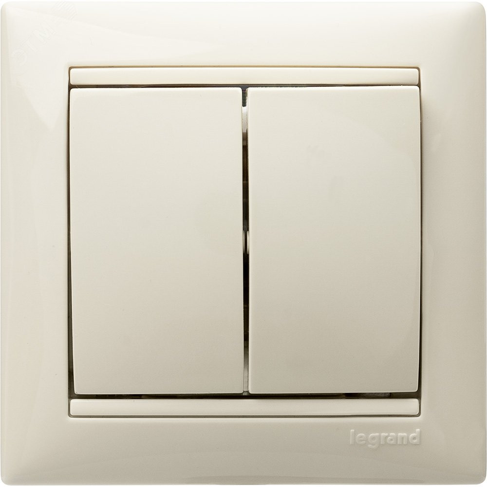 Представляет собой механизм выключателя с двумя клавишами. Цвета слоновой кости. Изготовлен из пластика. Монтируется под штукатурку.