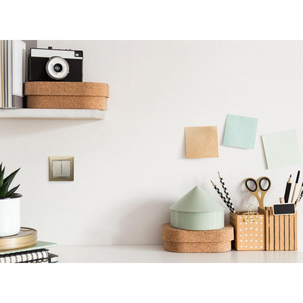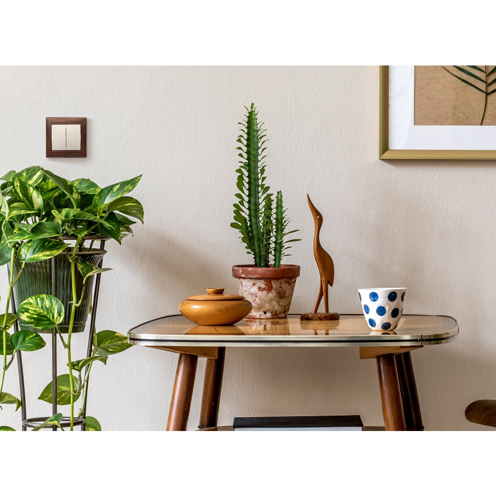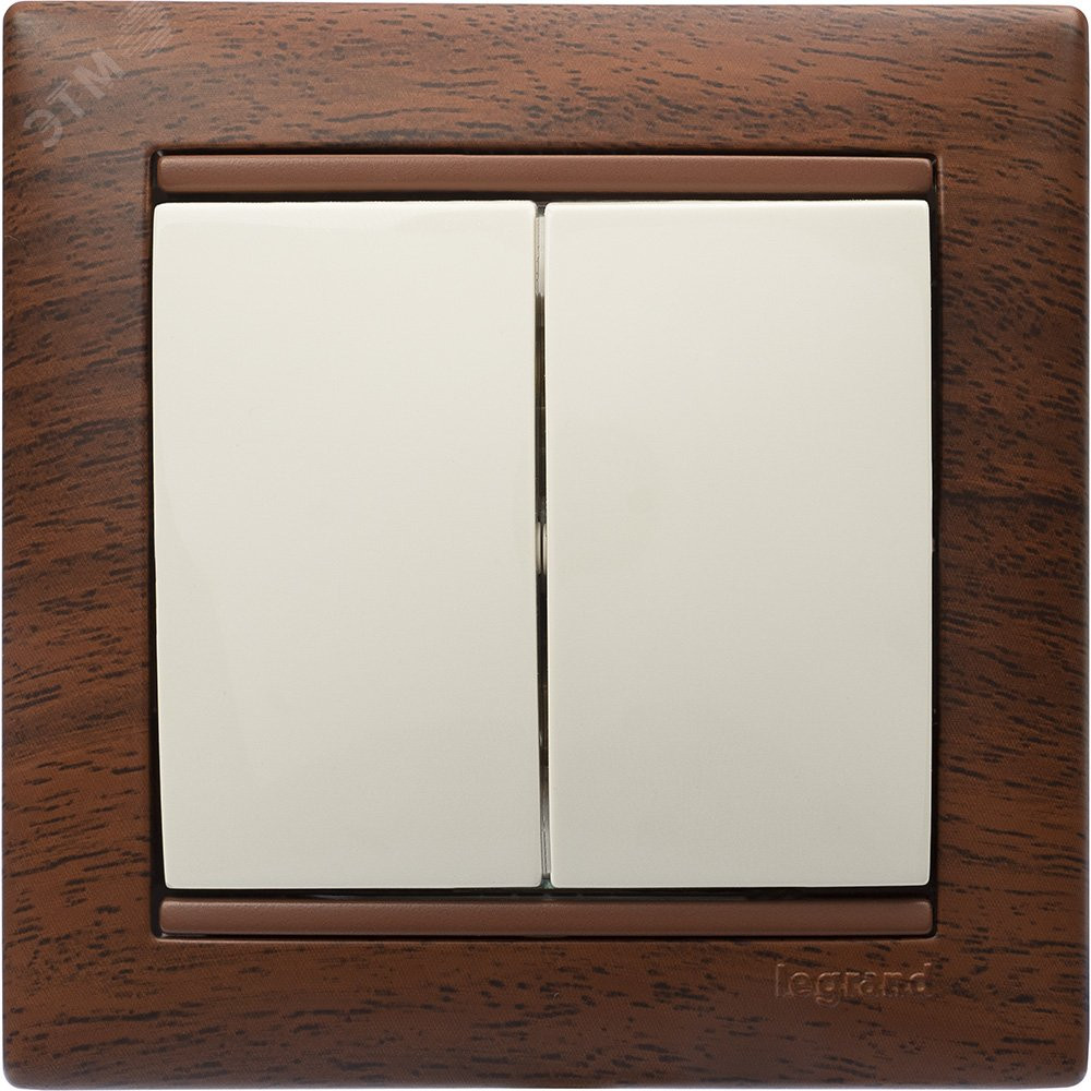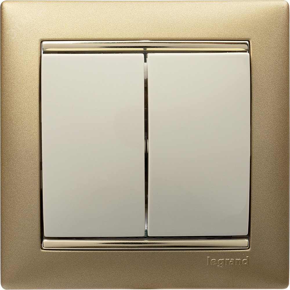 Представляет собой механизм выключателя с двумя клавишами. Цвета слоновой кости. Изготовлен из пластика. Монтируется под штукатурку.
