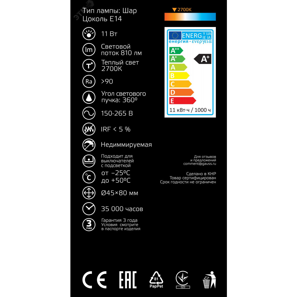 Описание Лампа светодиодная филаментная Black Filament 11Вт P45 шар 2700К тепл. бел. E14 810лм 105801111