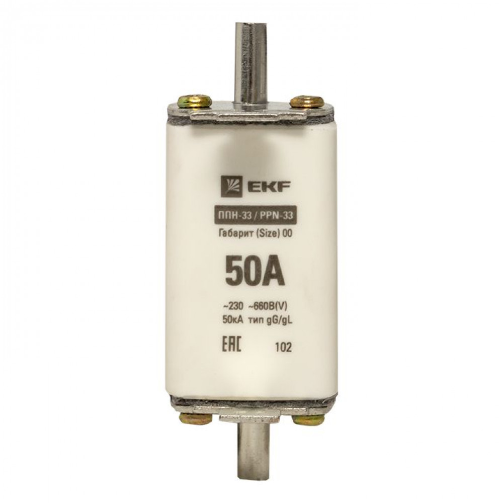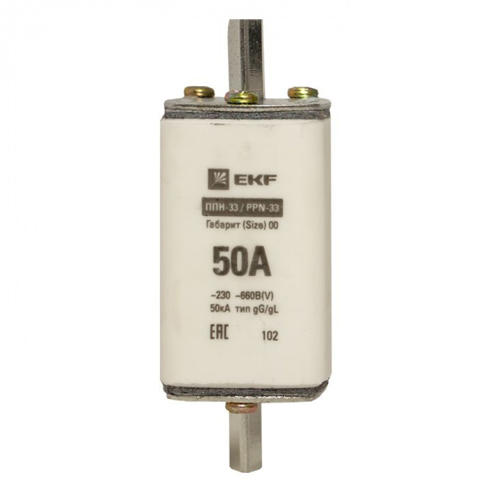 Плавкая вставка ППН-33 160/ 50А габарит 00 EKF. Предохранители плавкие ППН EKF, укомплектованные плавкими вставками типа gG/gL, предназначаются для защиты кабельных линий и промышленных электроустановок от токов перегрузки и короткого замыкания. Предохранители применяются в электрических сетях переменного тока частотой 50 Гц с напряжением до 660В. Применяются для крепления в распределительных и вводно-распределительных устройствах. Предохранители плавкие ППН могут устанавливаться в основание с держателем, а также в специально предназначенные рубильники. В комплект поставки предохранителей плавких ППН основание с держателем не входит и приобретается отдельно.
