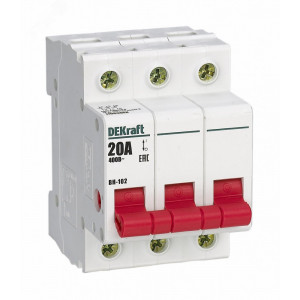 Выключатель-разъединитель серии ВН-102 DEKraft; 3P; номинальный ток 20 А; установка – на DIN-рейку; установочное положение - любое. Выключатели-разъединители применяются для ручного включения/отключения сетей напряжением до 400 В. Специальные мостиковые контакты обеспечивают надежный разрыв цепи; они полностью исключают возможность перекрытия дугой по изоляции. Усиленная рукоятка управления обеспечивает большое количество включений/отключений.
