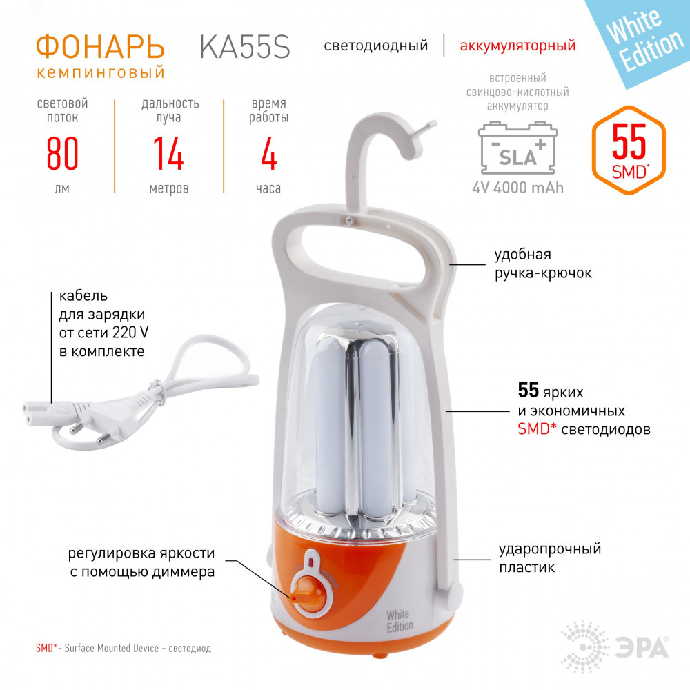 Описание Фонарь кемпинговый светодиодный KA55S аккумуляторный с диммером и складным крючком яркий светильник бело-оранжевый Б0025621