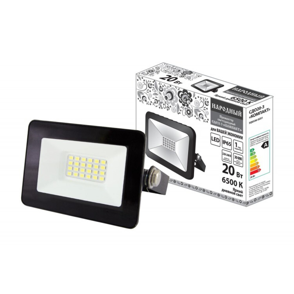 Прожектор светодиодный СДО20-3 "КОМПАКТ" 20 Вт, 6500 К, черный, Народный SQ0336-0251, Прожектор
