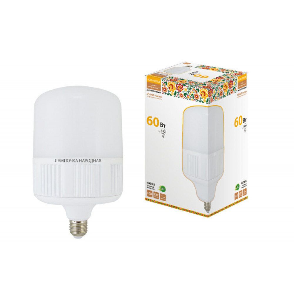 Описание Лампа светодиодная T-60 Вт-230 В-4000 К–E27 (160x265 мм) Народная SQ0340-1583