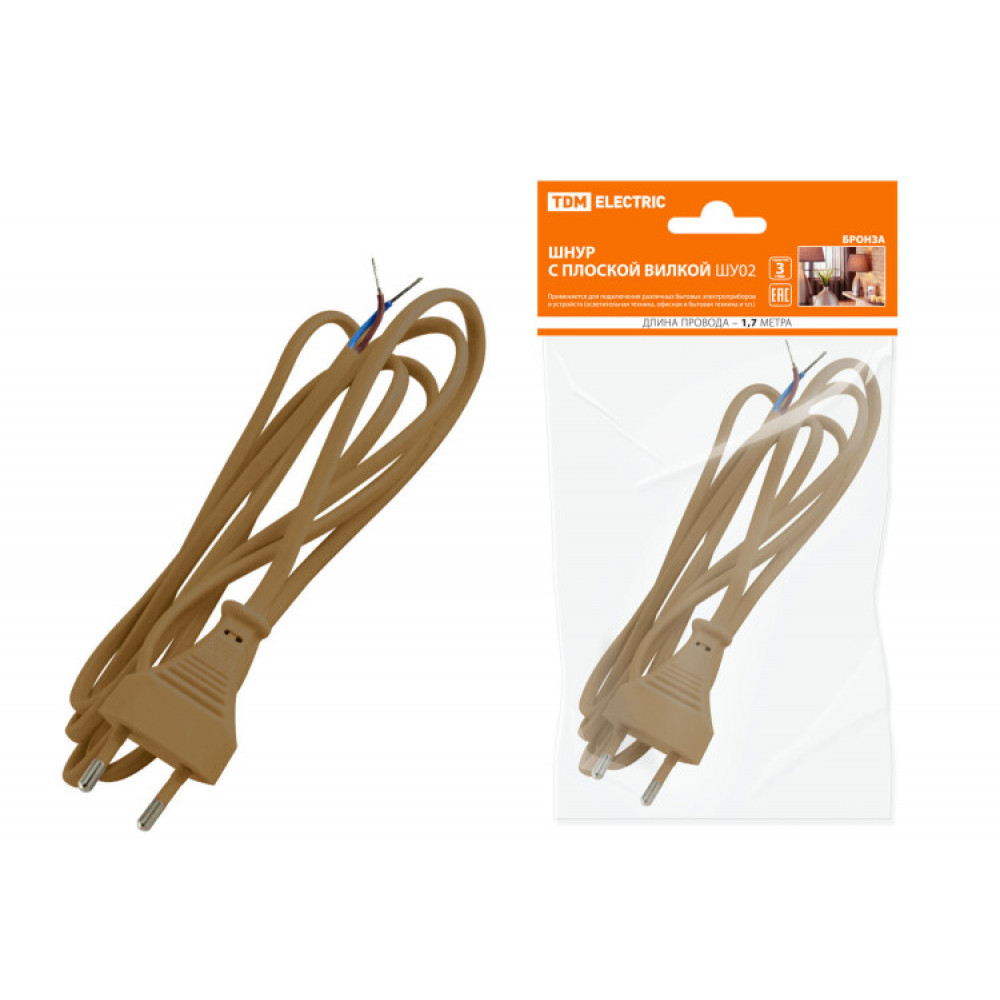 Описание Шнур с плоской вилкой ШУ02 ШВВП 2х0,75мм2 1,7 м. бронза SQ1305-0013