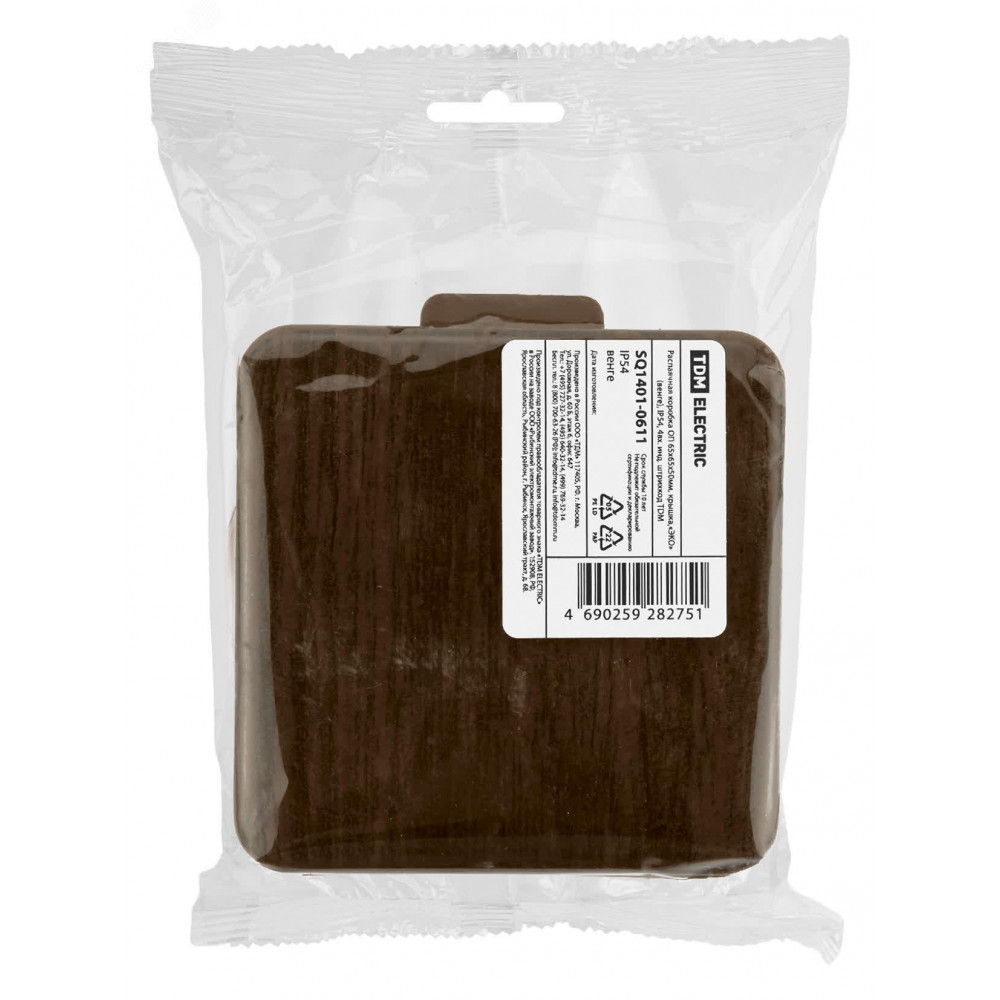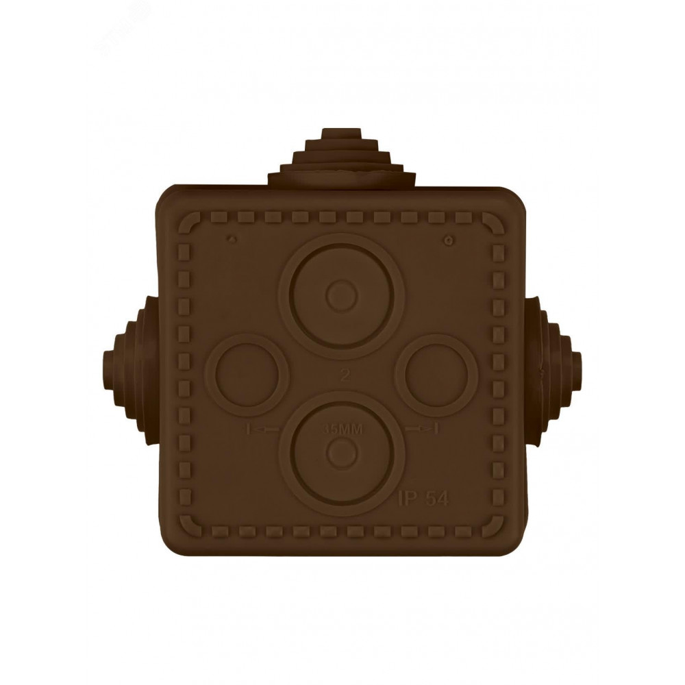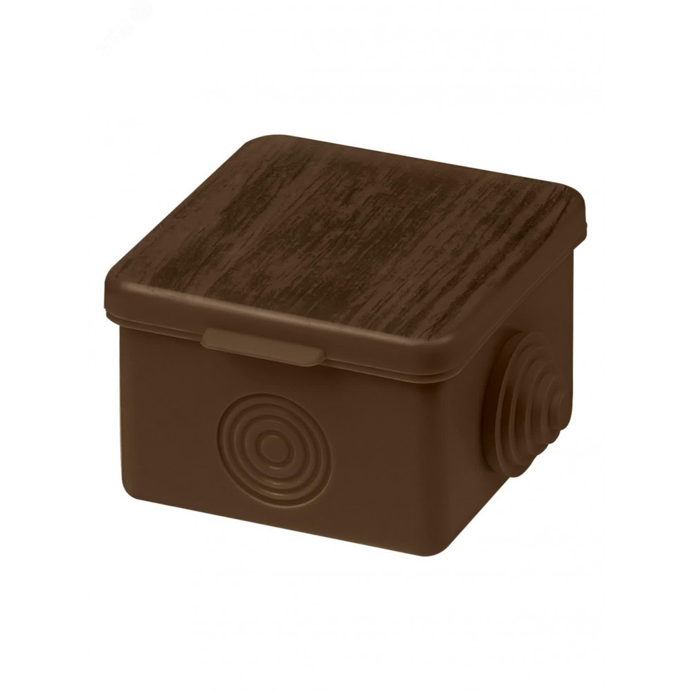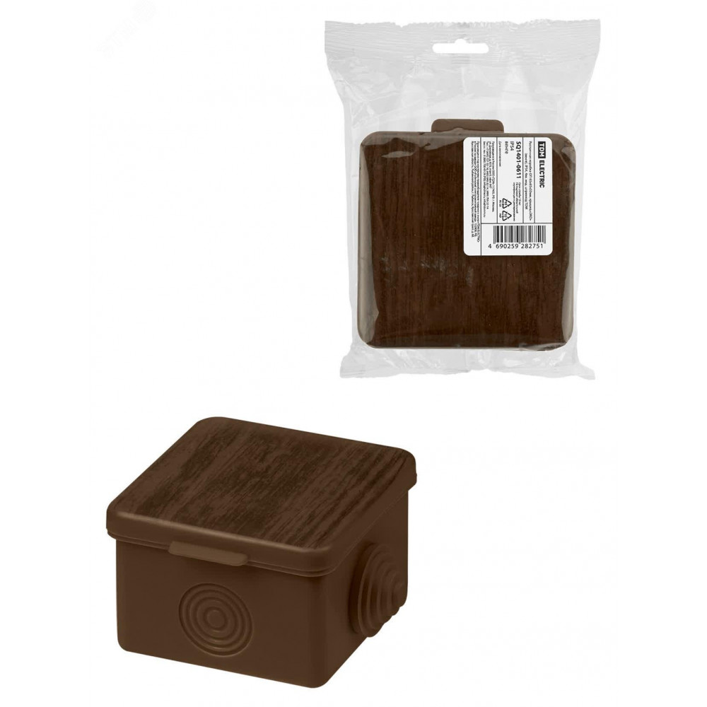 Описание Распаячная коробка ОП 65х65х50мм, крышка, "ЭКО" (венге), IP54, 4вх. инд. штрихкод SQ1401-0611