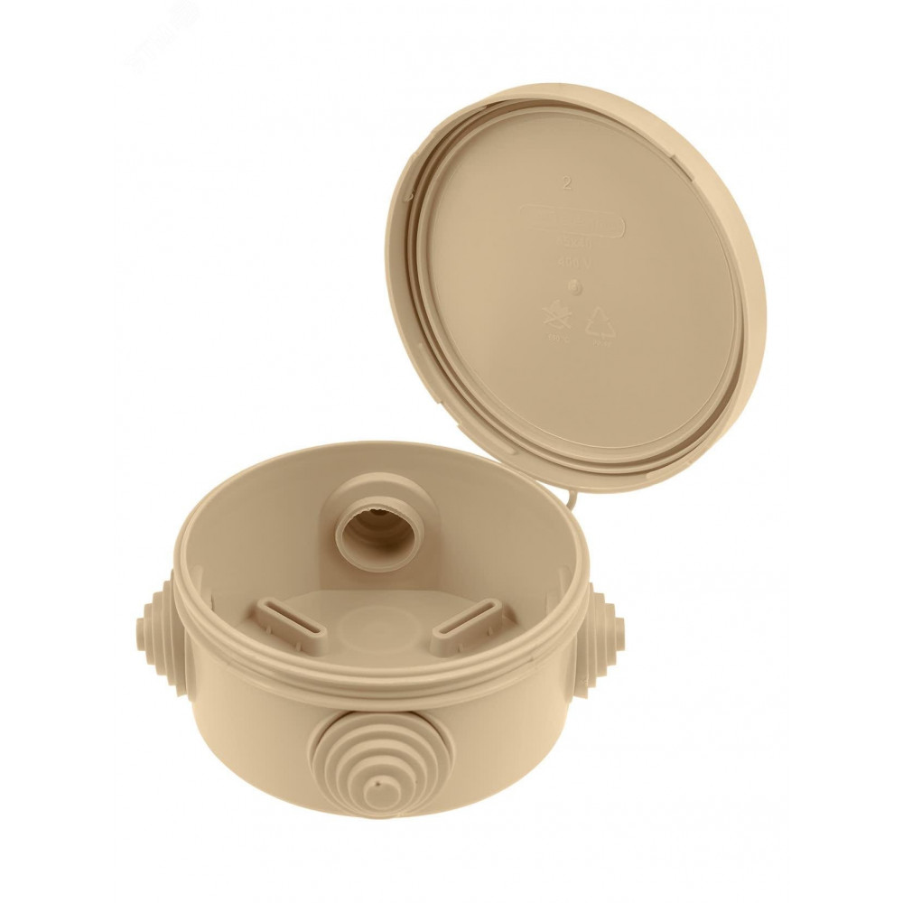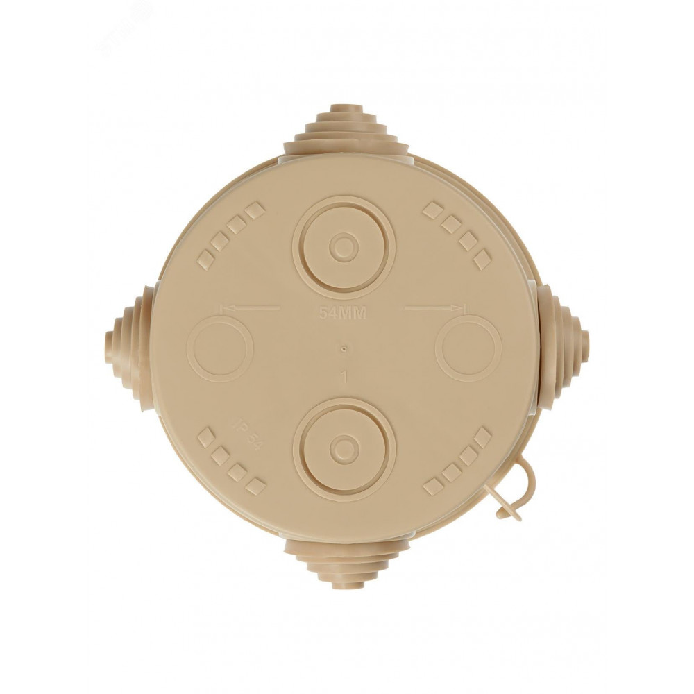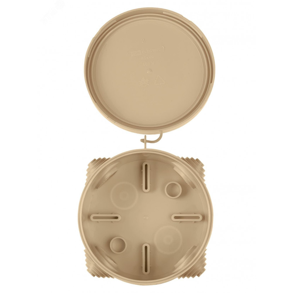 Описание Распаячная коробка ОП D85х40мм, крышка, "ЭКО" (сосна), IP54, 4вх. инд. штрихкод SQ1401-0702