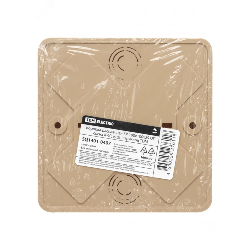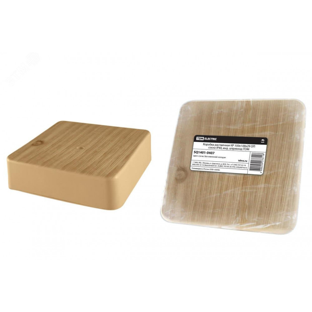 Описание Коробка распаячная КР 100х100х29 ОП сосна IP40, инд. штрихкод SQ1401-0407