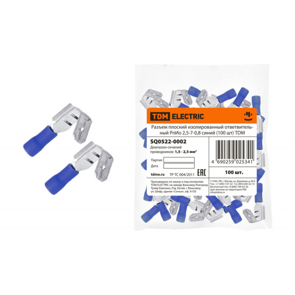 Описание Разъем плоский изолированный ответвительный РпИо 2,5-7-0,8 синий (100 шт) SQ0522-0002