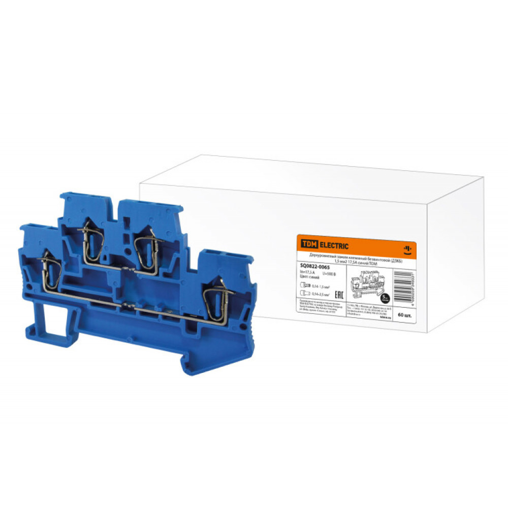 Двухуровневый зажим клеммный безвинтовой (ДЗКБ) 1,5 мм2 17,5А синий SQ0822-0065, Клемма на DIN-рейку